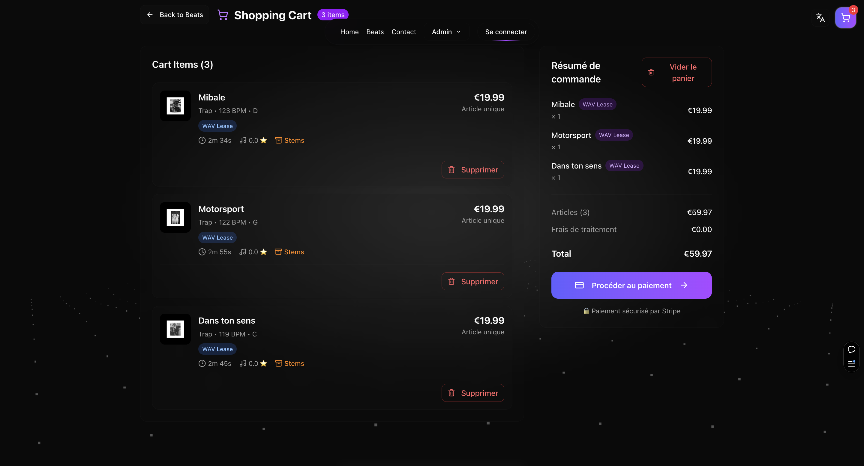 Unlike many beat marketplaces that only allow single-item purchases, l.outsider supports adding multiple beats with different license types to a cart in a single transaction.